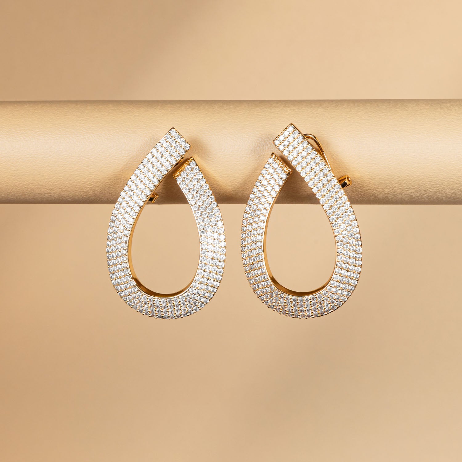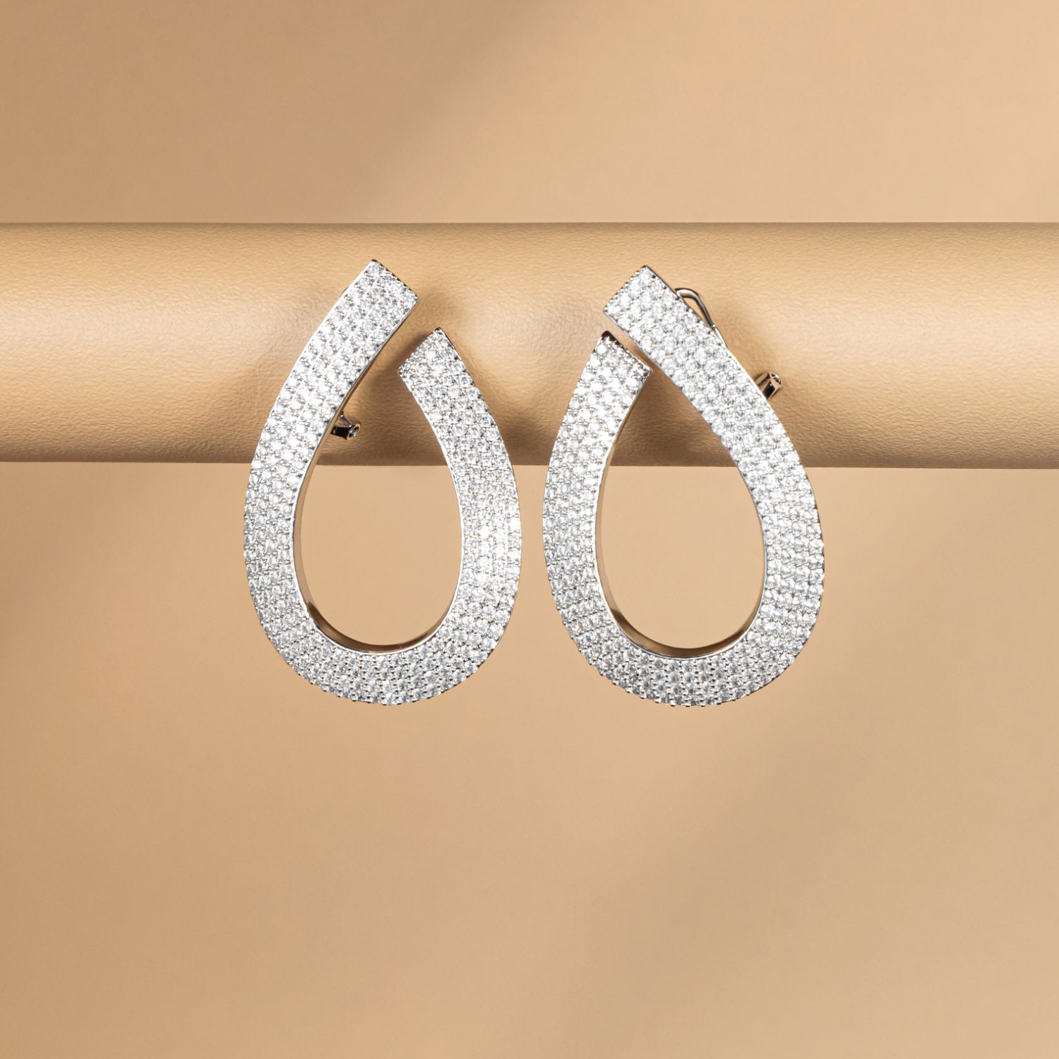 Sleek and striking, these U-shaped hoops redefine classic elegance. Encrusted with shimmering stones all over, their unique silhouette adds a modern edge to your look while keeping the sparkle timeless. Perfect for day-to-night glam.