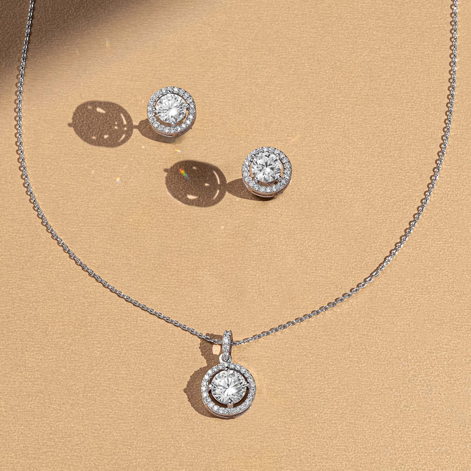 A classic circle solitaire pendant framed with sparkling diamonds, paired with matching studs — symbolizing wholeness, infinity, and effortless elegance. Its timeless design makes it a versatile choice for both everyday wear and special occasions.